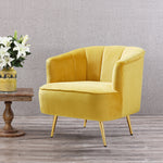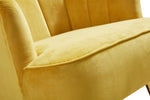 Curl up and unwind in this retro-style wingback accent chair. Inspired by vintage designs, its plush marigold velvet upholstery with luxurious channeling is an instant invitation to relax. The chic caps on its golden wood legs complete its retro look.